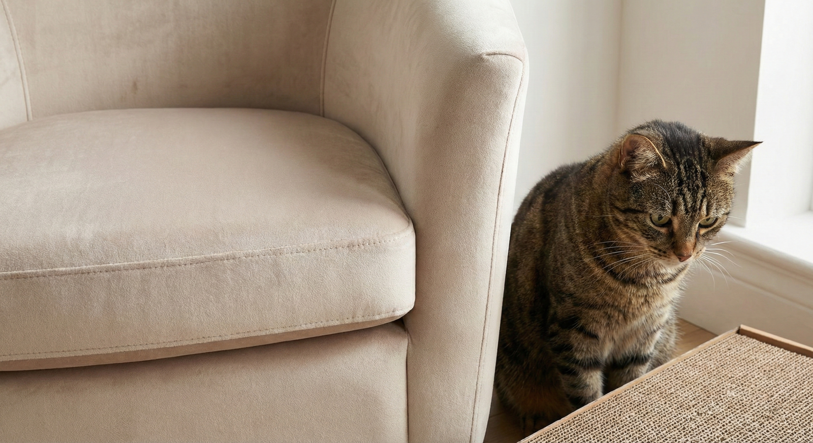 結果: 當貓咪發現這張沙發「很難抓」、「很無聊」時,牠們通常會主動放棄,轉而去尋找旁邊觸感更好的瓦楞紙板或麻繩。這就是為什麼有效的防護是讓貓咪「失去興趣」。