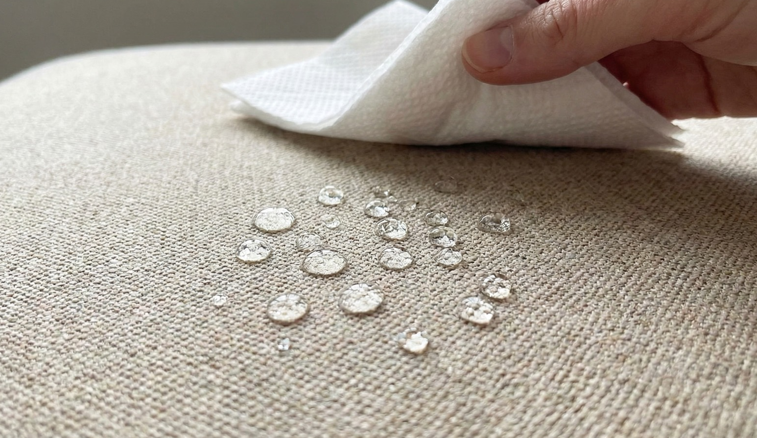 貓抓布通常結合了先進的防潑水塗層技術(Water Repellent),在布料表面形成類似「荷葉效應」的保護膜。 當飲料打翻或寵物嘔吐時,液體會凝結成水珠狀滾落,而不會立刻滲透進纖維內部。這給了使用者黃金處理時間,只需用紙巾輕輕吸附擦拭即可,大幅降低了布沙發最令人頭痛的清潔問題,讓布沙發也能擁有令人驚艷的抗污力。